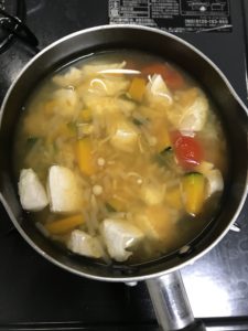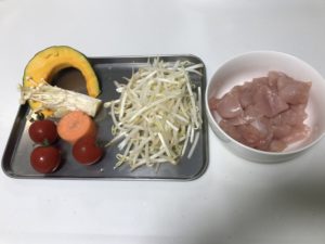 野菜類に火が通ったら鶏肉を入れて、器に移し粗熱を取ります。
